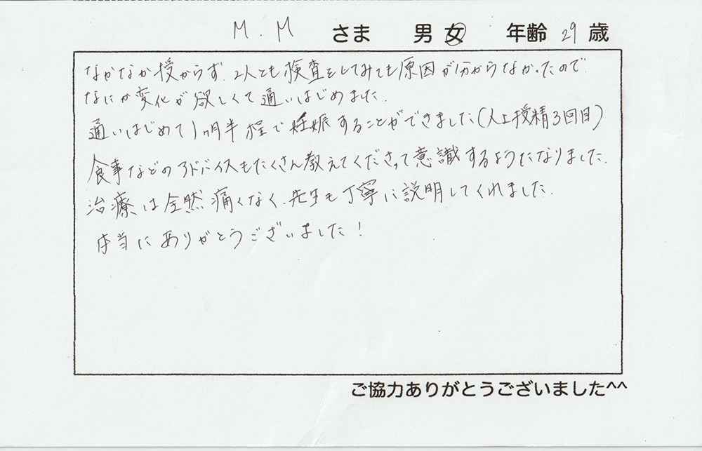 不妊治療中は上手くいかず不安なことが沢山ありましたが、こちらに通わせてもらって少しずつ解消できて良かったです。