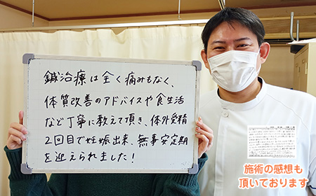鍼灸は痛みもなく、治療中に不妊治療についての疑問や不安を気軽に相談できたこともとても心強かったです。