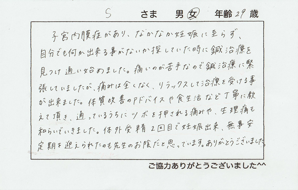 子宮内膜症があり、なかなか妊娠に至らず、自分でも何か出来る事がないか探していた時に鍼治療を見つけ通い始めました。