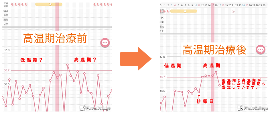 治療前にはガタガタしていて低温期と高温期の見分けも難しい状態の基礎体温でしたが、約1ヶ月の鍼灸治療後にはホルモンバランスが整って基礎体温が安定して低温期と高温期もはっきりと分かれて良い状態になっています。
