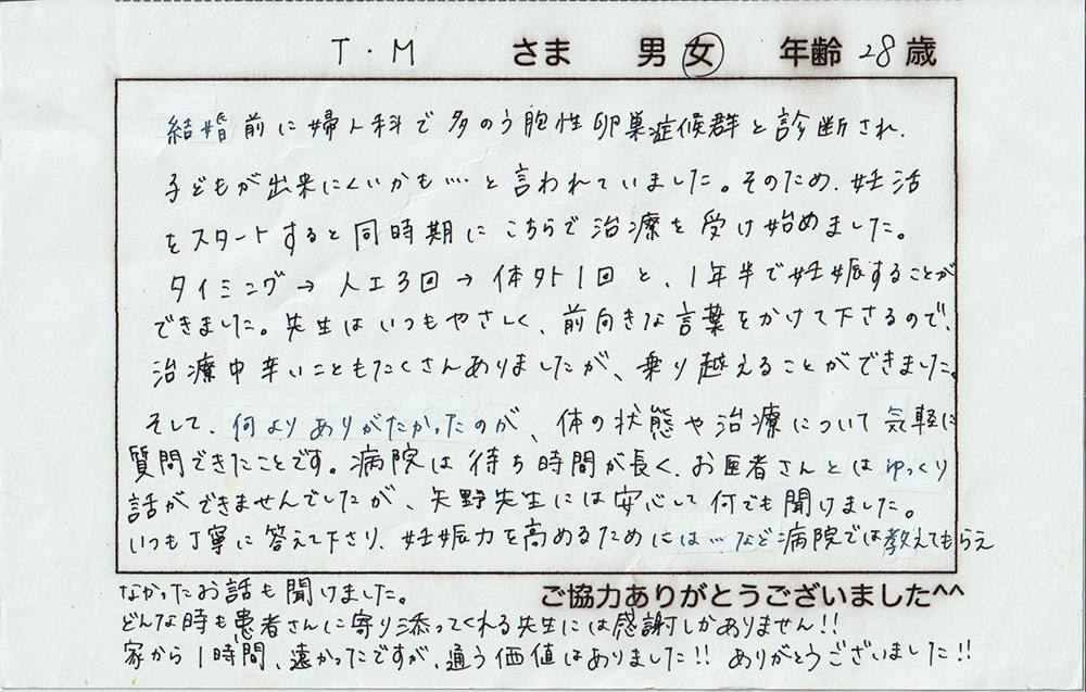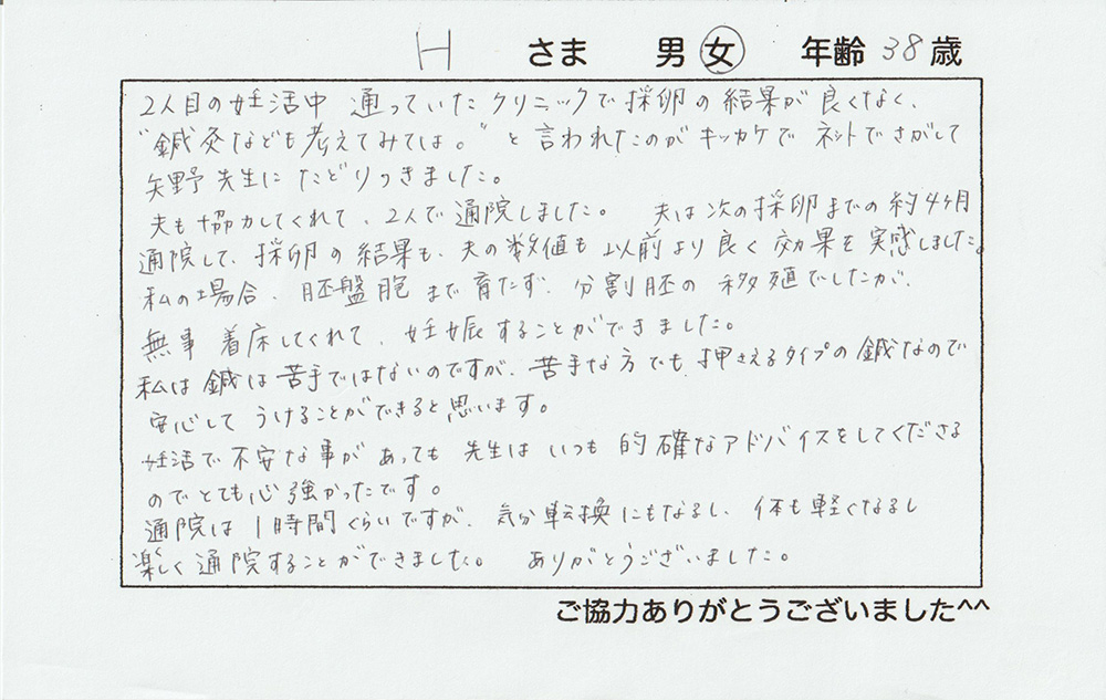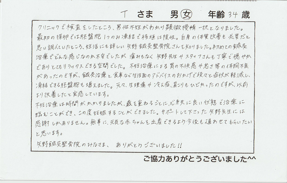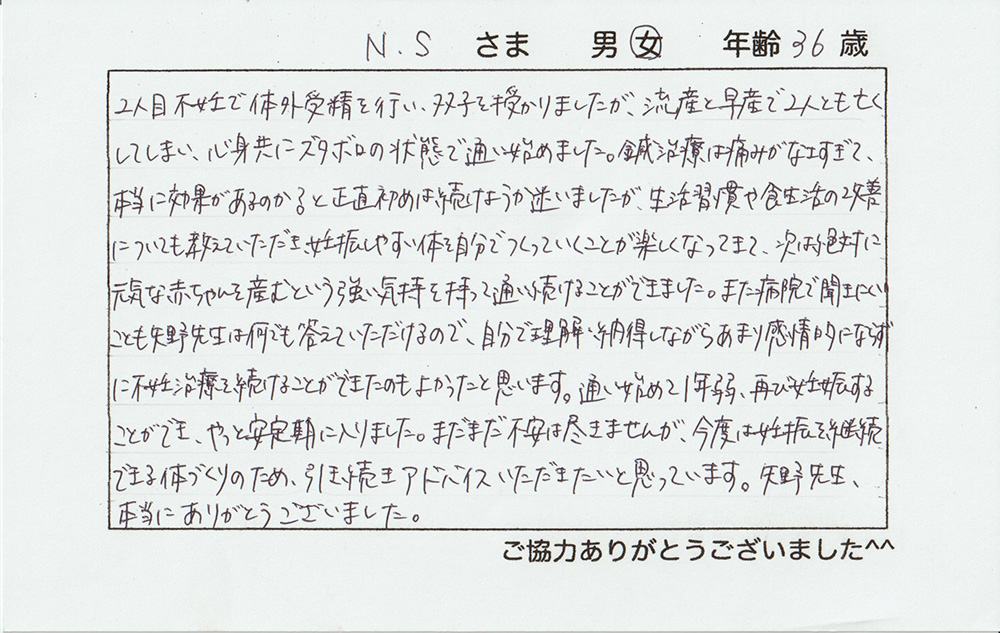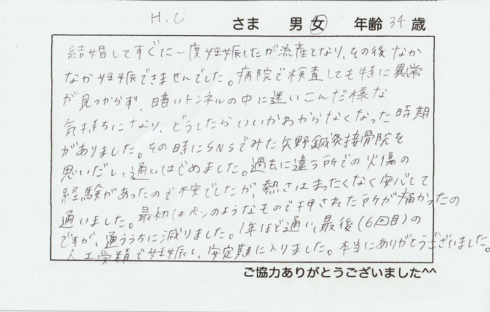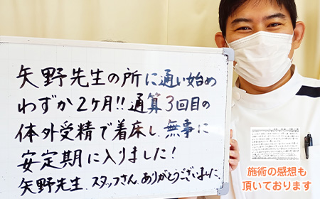 不妊治療は時間がかかりましたが、歳を重ねるごとに、心身共に良い状態で治療に臨むことができ、この度妊娠することができました。サポートして下さった矢野先生には感謝しかありません。無事に赤ちゃんを出産できるように今後ともかよわせてもらいたいと思います。