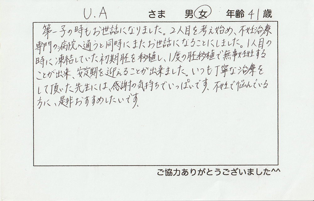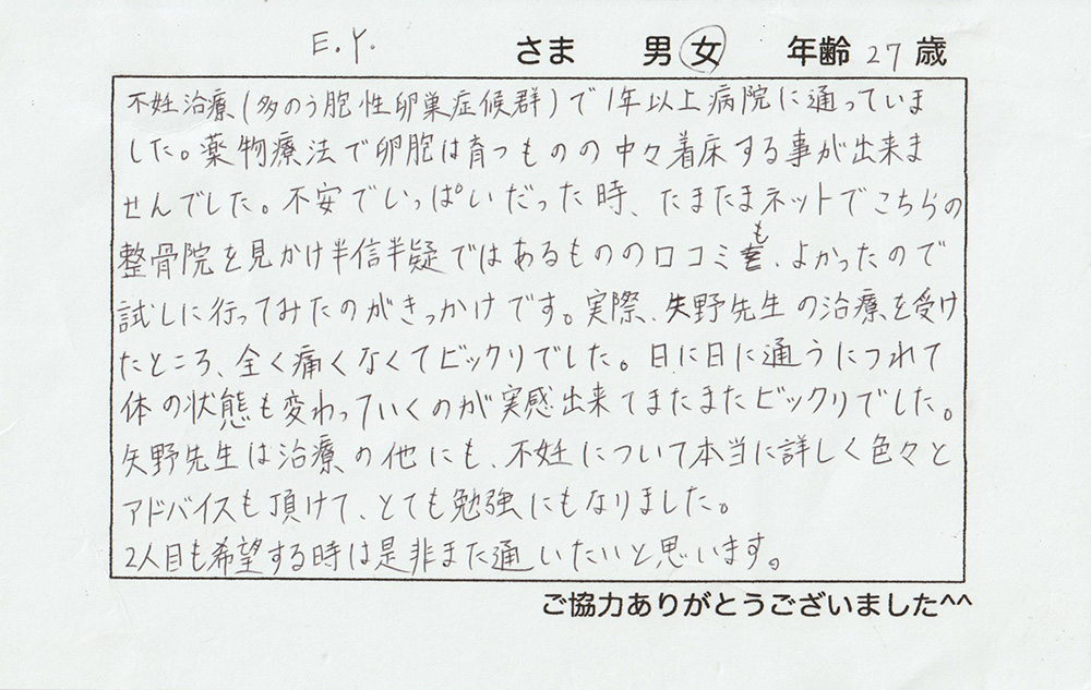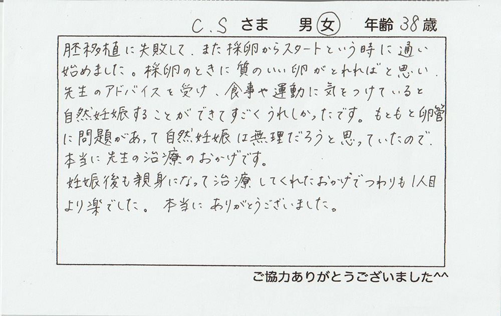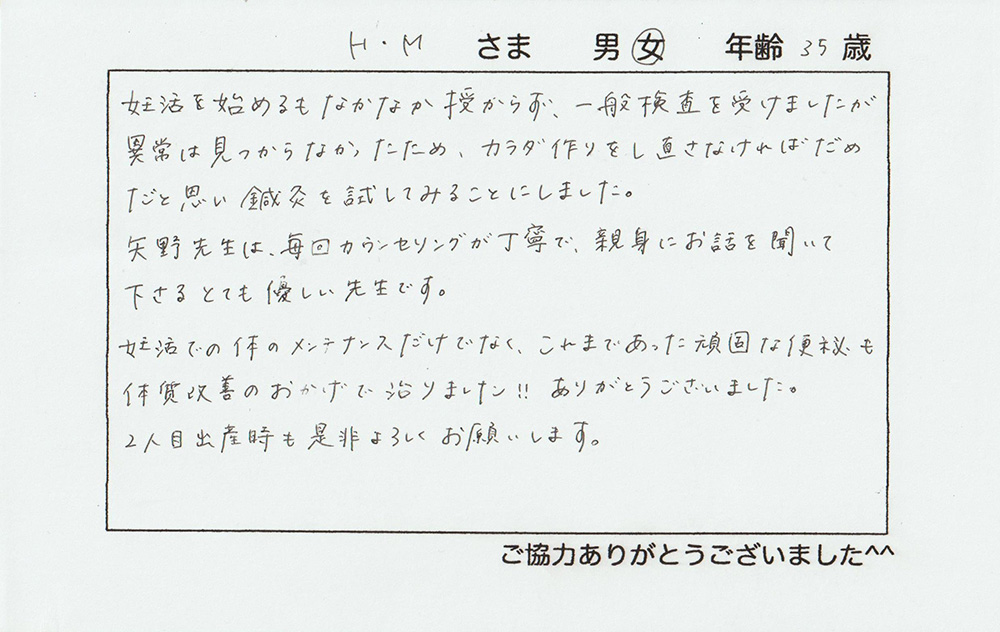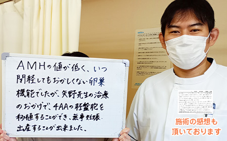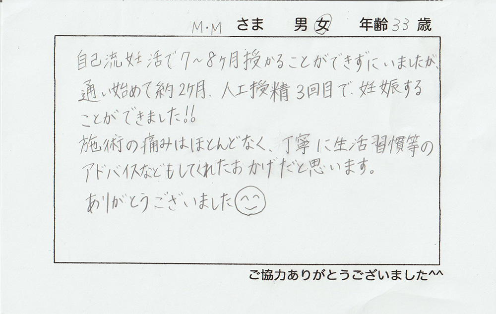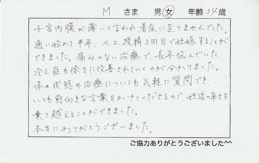 不妊治療は時間がかかりましたが、歳を重ねるごとに、心身共に良い状態で治療に臨むことができ、この度妊娠することができました。サポートして下さった矢野先生には感謝しかありません。無事に赤ちゃんを出産できるように今後ともかよわせてもらいたいと思います。