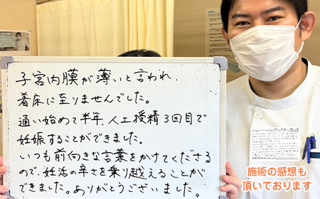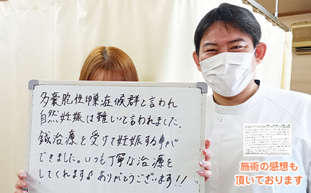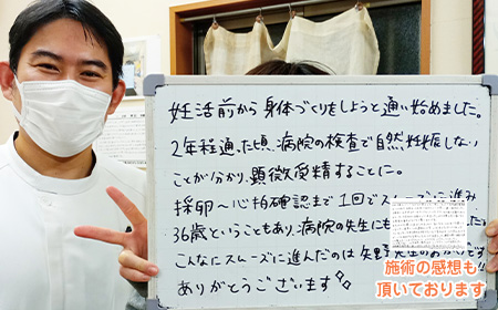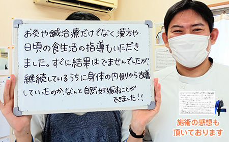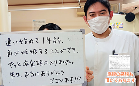 他にも妊活に役立つ知識を教えて頂いたり、不妊治療でのめまい、肩こり、甲状腺の異常など症状が出た時に解決策を考えてもらって心強かったです。