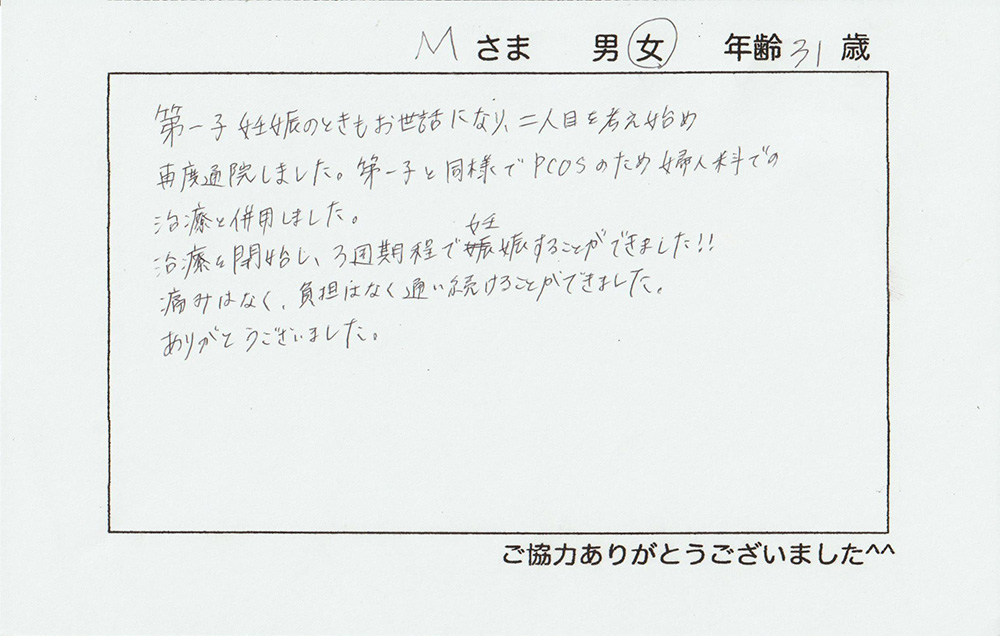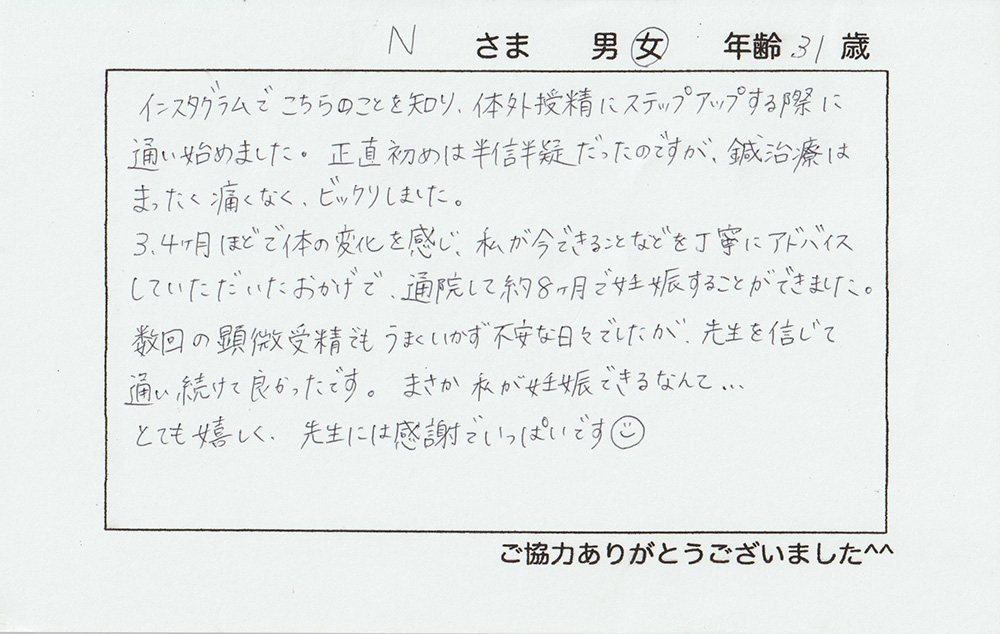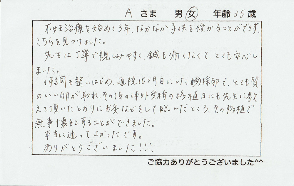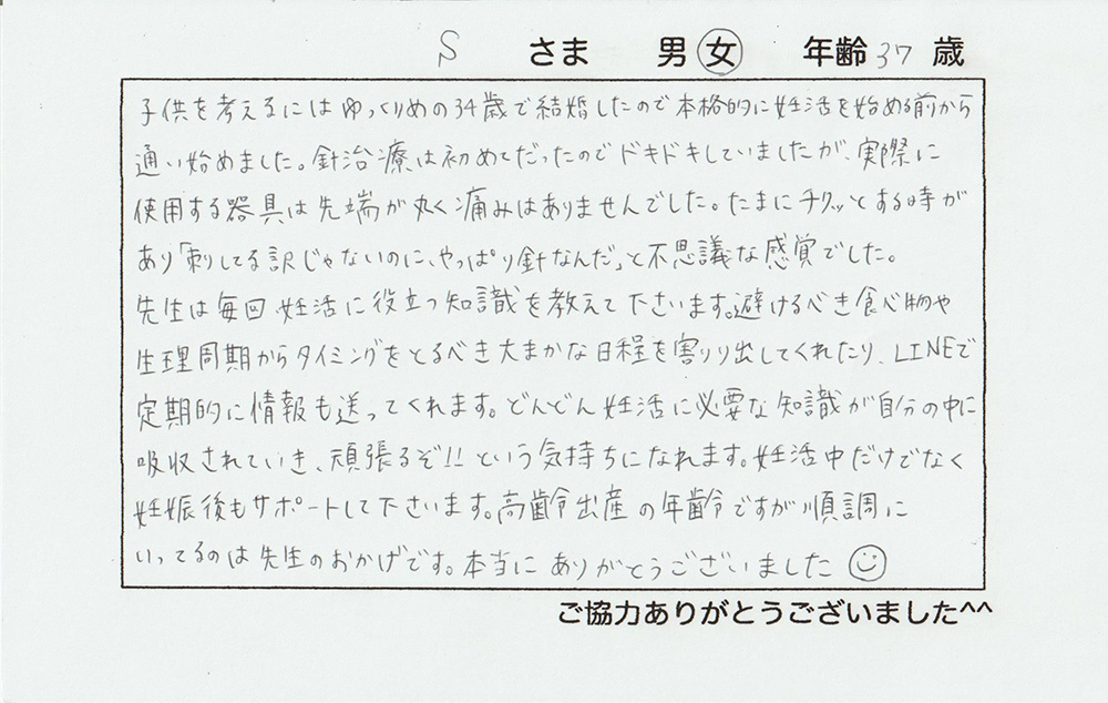 鍼灸は痛みもなく、治療中に不妊治療についての疑問や不安を気軽に相談できたこともとても心強かったです。
