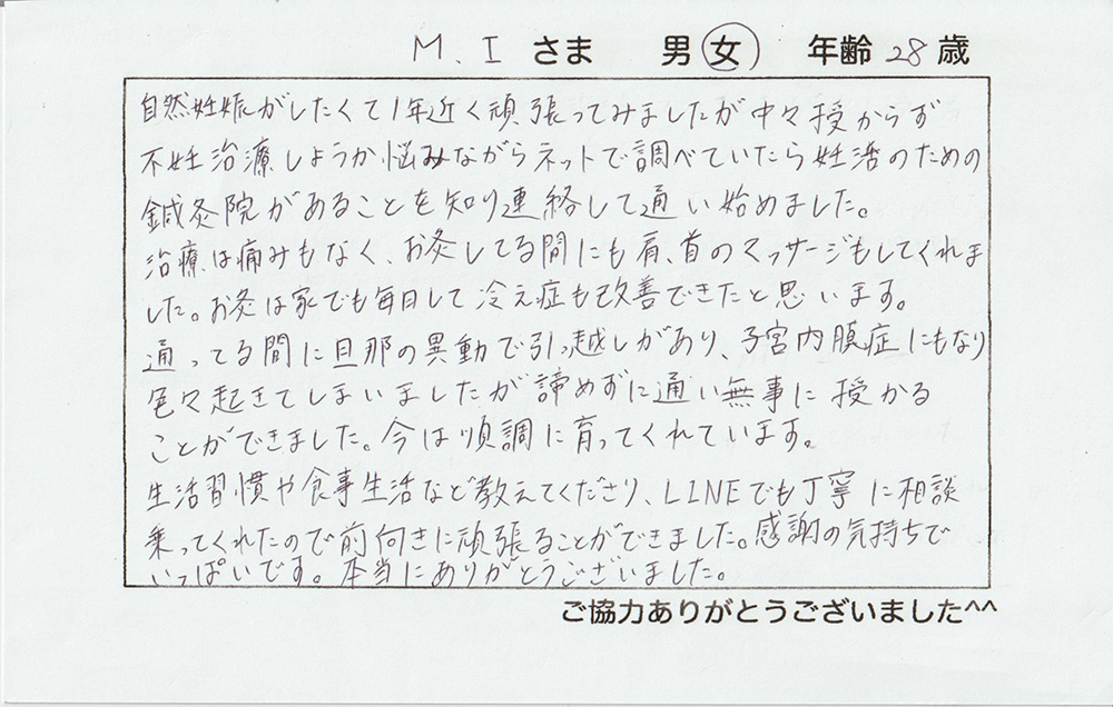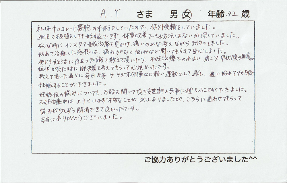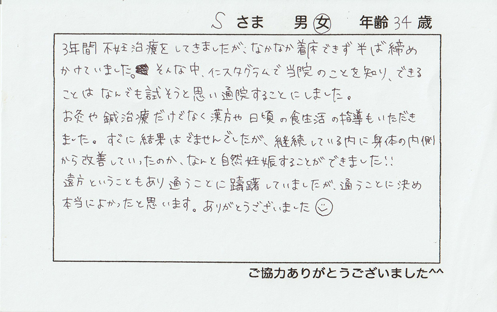 教えて頂いた通りに毎日お灸やラジオ体操など軽い運動をして過ごし、通い始めて4ヵ月後に妊娠することができました。