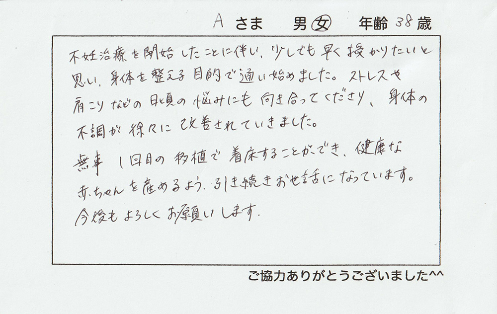 不妊治療による胃の不快感や怠さ等の体調不良があったのですが、鍼灸治療と食事など生活面のアドバイスのおかげで段々と症状が軽減し、凍結できる胚盤胞も増えました。元々生理痛や冷え症、肩こりもひどかったのですが、以前より改善したと実感しています。