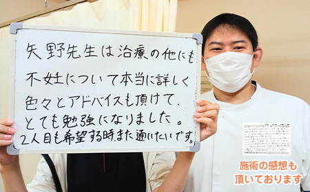 矢野先生は治療の他にも、不妊について本当に詳しく色々とアドバイスも頂けて、とても勉強になりました。